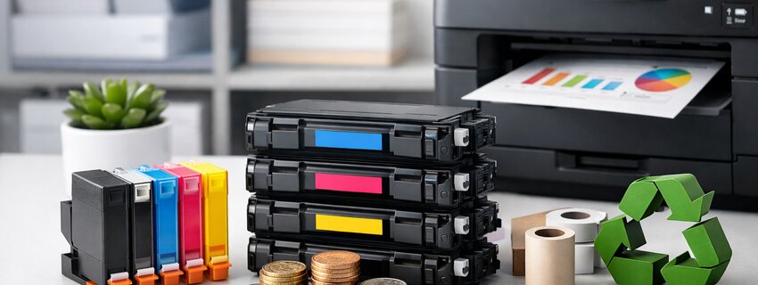 Os custos de impressão incluem não só o preço unitário do tinteiro, mas também armazenagem, gestão de stocks e tempo de inactividade associado a falhas. Em muitas empresas, a escolha de consumíveis originais é automática, apesar de alternativas mais económicas existirem.