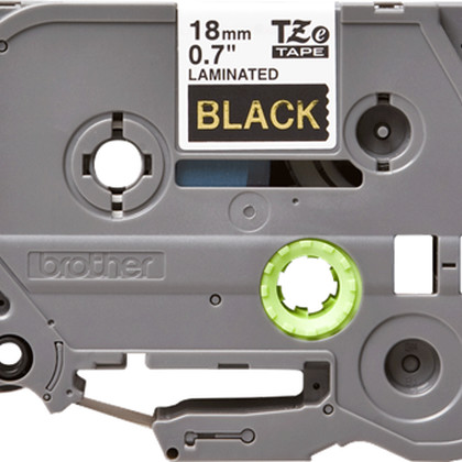 Fita laminada. Texto dourado sobre fundo preto. Largura: 18 mm. Comprimento: 8 m - Brother TZe-344