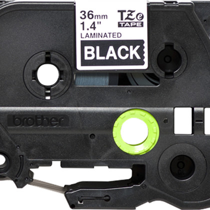 Fita laminada. Texto branco sobre fundo preto. Largura: 36 mm. Comprimento: 8 m - Brother TZe-365