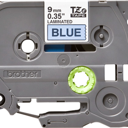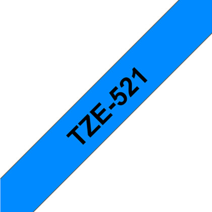 Fita laminada. Texto preto sobre fundo azul. Largura: 9 mm. Comprimento: 8 m - Brother TZe-521