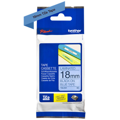 Fita laminada. Texto preto sobre fundo azul. Largura: 18 mm. Comprimento: 8 m - Brother TZe-541