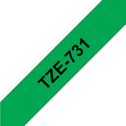 Fita laminada. Texto preto sobre fundo verde. Largura: 12 mm. Comprimento: 8 m - Brother TZe-731