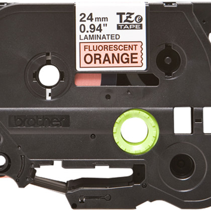 Fita laminada. Texto preto sobre fundo laranja fluorescente. Largura: 24 mm. Comprimento: 5 m - Brother TZe-B51