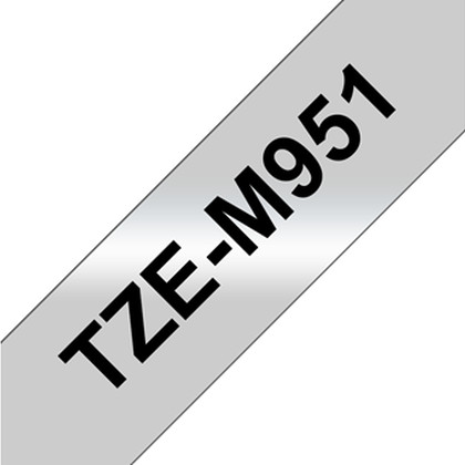 Fita laminada. Texto preto sobre fundo prateado mate. Largura: 24 mm. Comprimento: 8 m - Brother TZe-M951