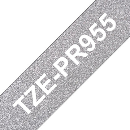 Fita laminada. Texto branco sobre fundo prata premium. Largura: 24mm. Comprimento: 8m - Brother TZe-PR955